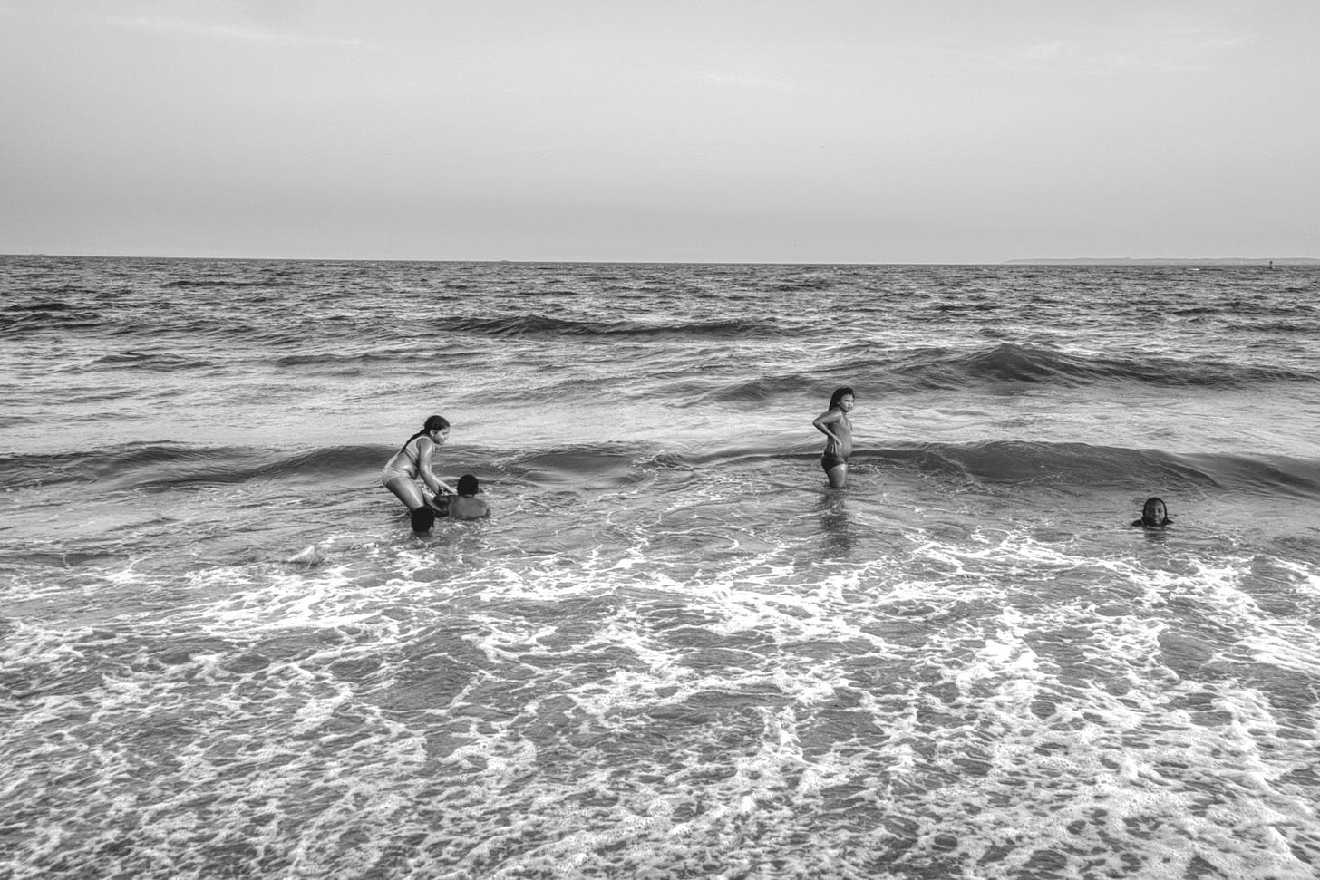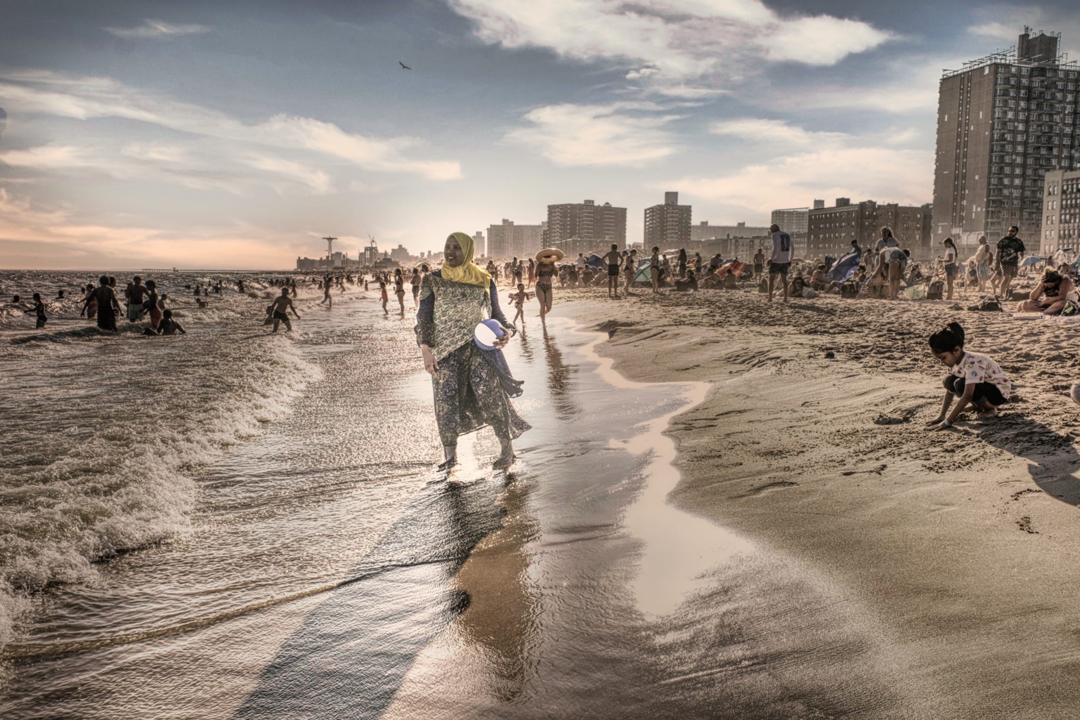 On the shore, women in hijab shepherd their children toward the water. The kids dart ahead, squealing when the tide rushes up, chasing it as the Atlantic tugs at their ankles.